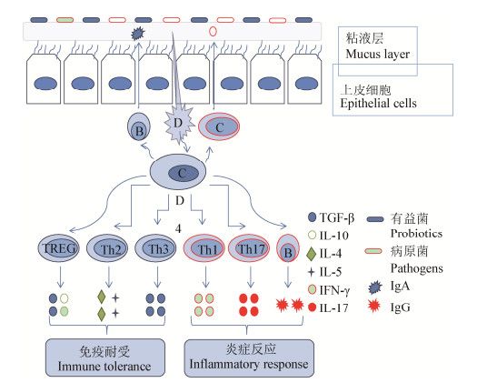 腸道粘膜免疫系統(tǒng)在對共生菌的免疫耐受和病原微生物的免疫應(yīng)答中處于動態(tài)平衡狀態(tài)。腸道上皮敏感細(xì)胞群(M細(xì)胞和潘氏細(xì)胞)作為腸道粘膜的“監(jiān)視者”,通過模式識別受體(pattern recognition receptor,PRR)識別微生物結(jié)構(gòu)成分-病原體相關(guān)分子模式(pathogen-associated molecular patterns,PAMP),迅速感應(yīng)菌群的變化,促進(jìn)M細(xì)胞和潘氏細(xì)胞分泌抗菌肽清除病原微生物,或通過信號傳遞免疫細(xì)胞、樹突狀細(xì)胞、自然殺傷細(xì)胞和巨噬細(xì)胞,促進(jìn)T細(xì)胞與B淋巴細(xì)胞分化成熟,誘導(dǎo)巨噬細(xì)胞分泌IL-10和TGF-β等抗炎因子釋放,誘導(dǎo)樹突狀細(xì)胞分泌IL-12和IL-10等細(xì)胞因子,調(diào)節(jié)Th17/Tregs、Th1/Th2平衡,提高腸道粘液中可溶性免疫球蛋白的水平;同時(shí),促炎性因子(IL-5、IL-6、IL-8、IL-17、IL-21、IL-22和IFN-γ)將嗜中性粒細(xì)胞募集到入侵部位響應(yīng)腸道微生物的變化,維護(hù)腸道相對穩(wěn)態(tài)(圖 1)。