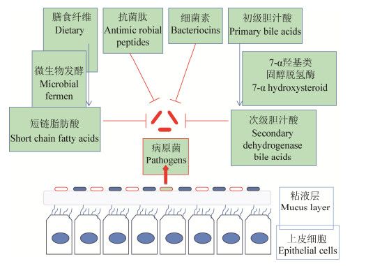 腸道內(nèi)微生物呈現(xiàn)了明顯的定殖分布。微生物與腸道粘膜的粘附、嵌合和結(jié)合,組成有一定規(guī)律的菌膜屏障結(jié)構(gòu),通過競爭病原菌的粘膜位點(diǎn)定殖、競爭營養(yǎng)物質(zhì)攝入以及產(chǎn)生代謝物抑制病原菌、促進(jìn)上皮細(xì)胞增殖分化或激活腸道粘膜免疫等方式抑制腸道內(nèi)病原菌的過度繁殖和易位,降低炎癥反應(yīng)和氧化應(yīng)激。