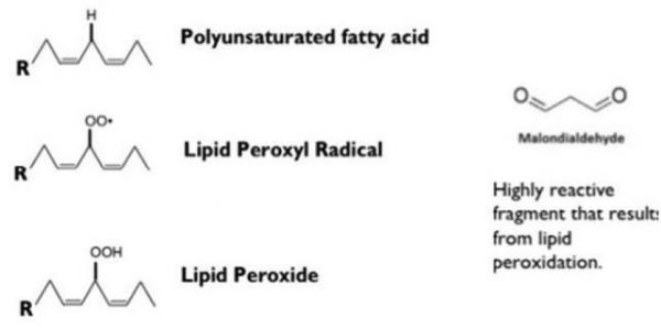 圖 2. 多不飽和脂肪酸特別容易受到脂質(zhì)過(guò)氧化的影響 在三類脂肪酸中,多不飽和脂肪酸特別容易受到稱為脂質(zhì)過(guò)氧化的氧化形式的影響。在高度調(diào)節(jié)的健康過(guò)程的背景下,脂質(zhì)過(guò)氧化確實(shí)在體內(nèi)酶促發(fā)生,但當(dāng)它自發(fā)發(fā)生時(shí),它會(huì)破壞有價(jià)值的脂肪酸并導(dǎo)致潛在的有毒副產(chǎn)物。此處顯示了這種有害形式的脂質(zhì)過(guò)氧化的關(guān)鍵方面。多不飽和脂肪酸是具有兩個(gè)或多個(gè)雙碳-碳鍵的任何形式的脂肪酸,其表示為雙線。位于兩個(gè)雙鍵之間的碳很容易失去其附著的氫和相關(guān)電子。如果發(fā)生這種情況,它就會(huì)變成脂質(zhì)自由基(未顯示),它很快被氧氣攻擊成為脂質(zhì)過(guò)氧自由基。該化合物是一個(gè)自由基(由點(diǎn)表示),這意味著它有一個(gè)不成對(duì)的電子。電子具有成對(duì)存在的強(qiáng)烈驅(qū)動(dòng)力,因此自由基具有高度反應(yīng)性。脂質(zhì)過(guò)氧自由基會(huì)氧化另一種分子——通常是營(yíng)養(yǎng)充足的生物系統(tǒng)中的維生素 E——從而變成脂質(zhì)過(guò)氧化物。脂質(zhì)過(guò)氧化物可以分解成小醛,如丙二醛,這些是危險(xiǎn)的,因?yàn)樗鼈兛梢耘c蛋白質(zhì)和其他大分子結(jié)合,從而改變它們的結(jié)構(gòu)和功能,可能導(dǎo)致組織損傷和代謝功能障礙。由于單不飽和脂肪酸只含有一個(gè)雙鍵,而飽和脂肪酸不含任何雙鍵,