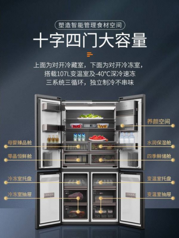 澳柯瑪BCD-616WPGEVS冰箱擁有夏日果蔬保鮮的黑科技。616升的大容量被分割為四個(gè)較大的獨(dú)立區(qū)間,上面為對(duì)開(kāi)冷藏室,下面是對(duì)開(kāi)冷凍室,還相應(yīng)的在傳統(tǒng)冷藏和冷凍之外,增加了一個(gè)容量107升可在5攝氏度~-20℃之間自由調(diào)節(jié)的變溫室和零晶恒鮮艙、四季鮮儲(chǔ)艙、水潤(rùn)保濕艙,以及特殊用途的母嬰臻品艙和養(yǎng)顏空間。三系統(tǒng)三循環(huán),獨(dú)立制冷不串味。分區(qū)儲(chǔ)存食物,每個(gè)分區(qū)的溫度都是可以獨(dú)立設(shè)定,按需調(diào)試,所以果蔬保鮮會(huì)更好,保鮮時(shí)間會(huì)更長(zhǎng),在很大的程度上解決了傳統(tǒng)冰箱將食物放在一起引起的串味、變味或雜味的問(wèn)題。十字對(duì)開(kāi)格局不但可以便捷的取所想要拿的食物,還減少了冷量的流失,降低了能耗更省電。