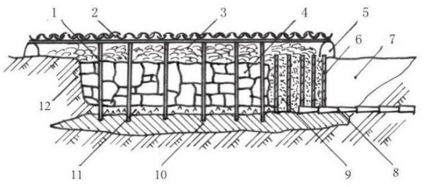 上圖_ 凌陰剖面圖,1網(wǎng)柱2屋面3草薦4冰塊5檐墻6槽門7入門8排水管9稻糠10夯土層11鋪設(shè)片巖層12生土層