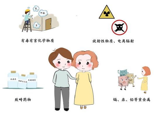 出生缺陷產(chǎn)生的原因是復(fù)雜的,目前認為引起出生缺陷的因素有基因突變等遺傳因素或環(huán)境因素(部分高危環(huán)境見圖2),也可能由遺傳與環(huán)境的交互作用以及其他尚不能確定的因素所致。環(huán)境與遺傳因素交互作用是引起出生缺陷的主要原因,約占出生缺陷總發(fā)生率的65%左右。