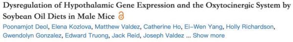 在實(shí)驗(yàn)中,研究人員給小鼠喂食分別含有大豆油、亞油酸含量低的大豆油、椰子油三種高脂肪飲食,結(jié)果發(fā)現(xiàn),喂食大豆油的小鼠體內(nèi)產(chǎn)生了100多個(gè)無法運(yùn)行的基因,包括產(chǎn)生催產(chǎn)素的基因,導(dǎo)致下丘腦的催產(chǎn)素水平明顯下降。