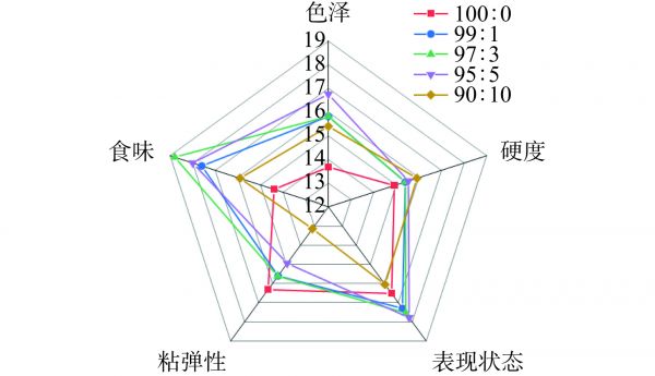 小麥粉與鱗杯傘粉添加比例 彈性(mm) 硬度(N) 內(nèi)聚性 膠粘性(N) 咀嚼性 100:0 0.940±0.03a 423.00±10.37e 0.301±0.02a 795.00±17.64a 340.00±22.51a 99:1 0.850±0.02b 629.00±10.83d 0.300±0.01a 670.00±11.87b 330.00±19.83a 97:3 0.801±0.05c 689.00±12.37c 0.300±0.01a 606.00±22.34c 335.00±16.24a 95:5 0.780±0.01d 809.00±15.64b 0.310±0.02a 569.00±19.34d 344.00±17.85a 90:10 0.760±0.01e 854.00±17.36a 0.300±0.01a 554.00±22.56d 348.00±24.39a 注:不同小寫字母表示同列字母差異顯著,P<0.05;表3~表5同。