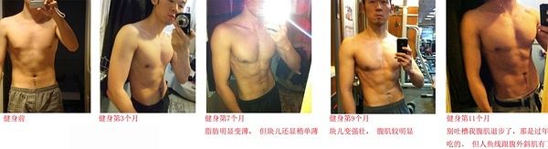 從左至右分別是: 健身前, 健身3個月, 健身7個月, 健身9個月, 健身11個月