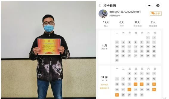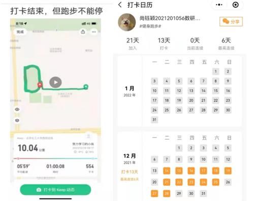2021年12月14日至12月28日,數(shù)理學(xué)院為期2周的跑步健身活動順利結(jié)束。本次活動旨在鼓勵同學(xué)們在科研之余,增強運動意識,以運動提高身體素質(zhì),以運動釋放壓力,進而以充沛的精力迎接每一天?;顒佑稍貉芯可鷷捏w部部長王云帆負責(zé),戴越、巨兆廷協(xié)助。