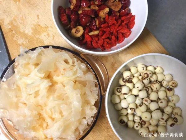 食材清單:銀耳(半朵)、蓮子(適量)、紅棗(2顆)、枸杞(適量)、冰糖(適量)。