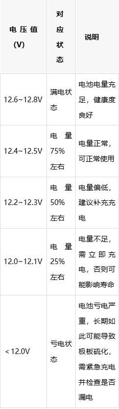 注意:若電壓<11.5V,可能是電池內(nèi)部短路或極板損壞,需進一步檢測內(nèi)阻。