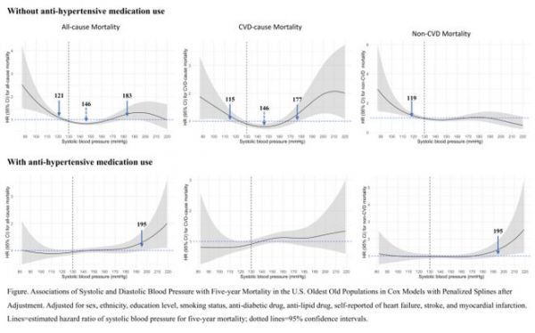 圖1:使用或未使用抗高血壓藥物的老年人群收縮壓與各種死亡風(fēng)險(xiǎn)之間的關(guān)系[3]