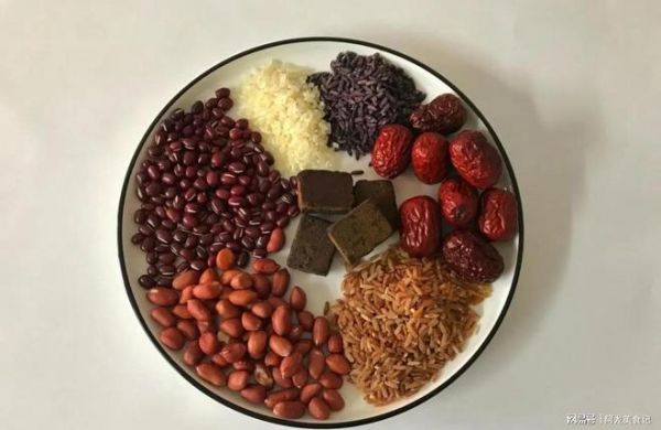 【材料】:紅豆50克,紅米50克,紅皮花生50克,紅棗8顆,紫米25克,糯米25克,紅糖適量,枸杞1小把