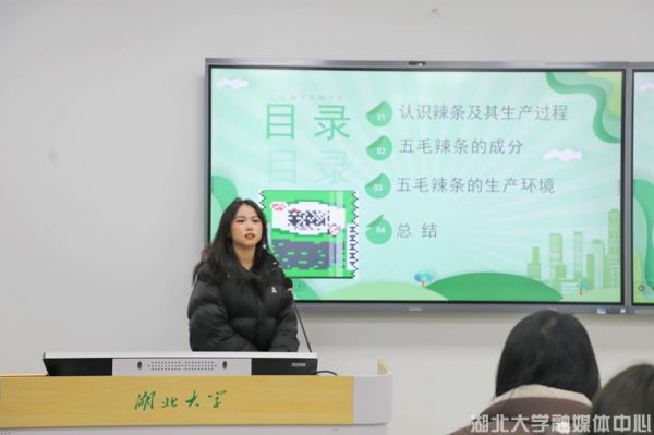 “外賣食品真的安全嗎?”“五毛辣條到底能不能吃?”12月18日晚,湖北大學(xué)第一屆食品安全科普競賽在陽邏校區(qū)舉辦。一系列貼近日常生活的科普,引起同學(xué)們的共鳴,現(xiàn)場互動氛圍熱烈。