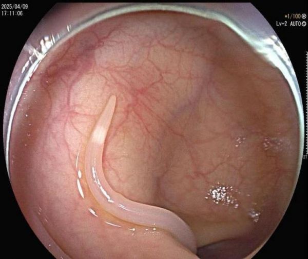 金女士(化名)近半年來反復(fù)出現(xiàn)下腹絞痛,自行服用藥物后未見緩解。到廣州中醫(yī)藥大學(xué)深圳醫(yī)院內(nèi)分泌科門診就診,接診醫(yī)師劉暢在細(xì)致問診和體格檢查后,初步排除了腸胃炎等常見病因,果斷為她安排了胃腸鏡檢查。經(jīng)脾胃病科醫(yī)師劉樂鑫腸鏡檢查,發(fā)現(xiàn)她的腸道內(nèi)竟然有一條白色細(xì)長的“小蟲子”在慢慢蠕動(dòng),原來是一條活體寄生蟲,醫(yī)師果斷通過腸鏡用活檢鉗夾住蛔蟲,慢慢將它從腸道里拖了出來。經(jīng)檢測(cè),該寄生蟲為蛔蟲,食用被蟲卵感染后的食物有可能導(dǎo)致肚子里長蛔蟲。