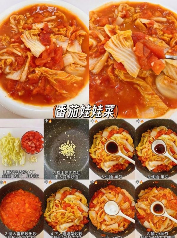 軟嫩的娃娃菜在番茄的包裹下,變得酸甜可口,一口娃娃菜,一口濃郁的番茄湯,滿滿的幸福感。家常又快手,是餐桌上百吃不膩的一道菜~