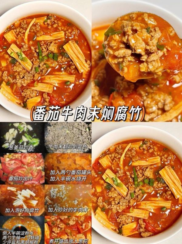 腐竹吸滿了番茄和牛肉末的湯汁,變得軟嫩又入味,牛肉末鮮香下飯,搭配酸甜的番茄,每一口都超滿足,妥妥的干飯神器!
