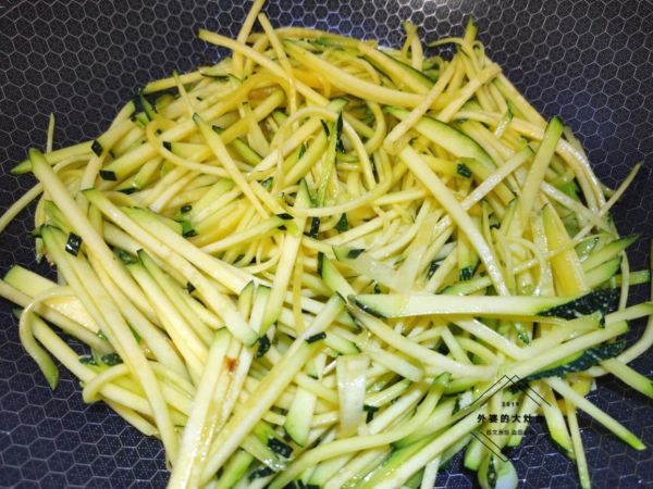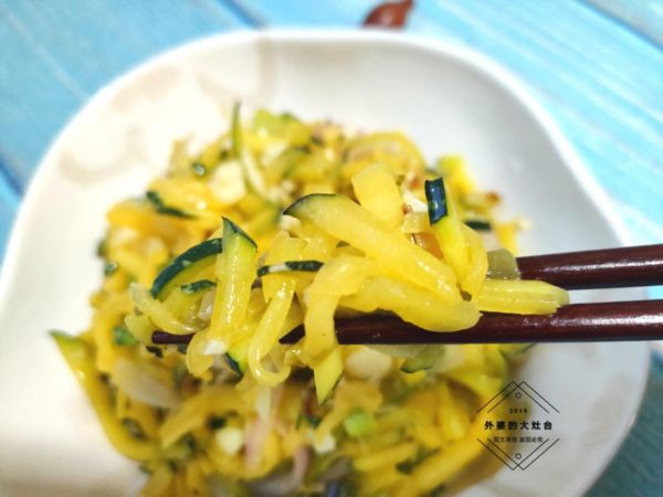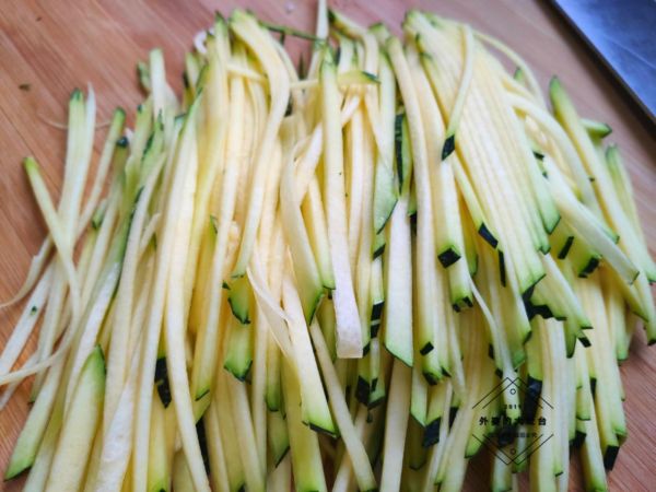 1、南瓜清洗干凈,先切成薄片,接著改刀切成絲。嫩南瓜肉質(zhì)比較細嫩,不適宜用工具叉絲,手工切的口感會好很多,盡量別偷懶哦!