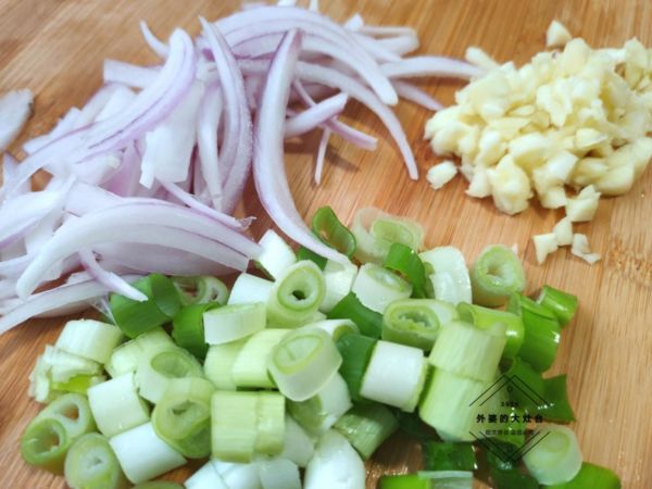 2、洋蔥切絲、大蒜切末、大蔥切圈,備用。大蒜分成兩半,分開來用,生蒜的營養(yǎng)價值更高,但是爆香的蒜味道比較好,分開來用,兩者兼而有之。