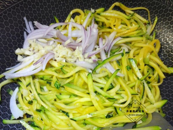 3、鍋中加入適量食用油,油溫5成熱時,放入其中一半蒜末、大蔥爆炒出香味,接著放入南瓜絲,翻炒半分鐘,至南瓜斷生。嫩南瓜不宜久炒,會失去脆嫩的口感。