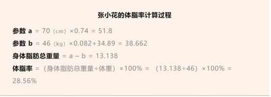 舉個(gè)例子。張小花,女生,腰圍70cm,體重46kg,使用公式計(jì)算就是:
