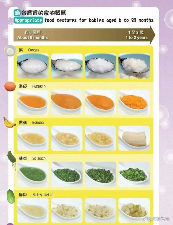 不同月齡寶寶輔食質(zhì)地應(yīng)分階段調(diào)整,具體可參照香港衛(wèi)生署發(fā)布的《6-24個月嬰幼兒健康飲食 起步篇》中“適合寶寶的食物質(zhì)感”內(nèi)容,各階段具體特征如下: