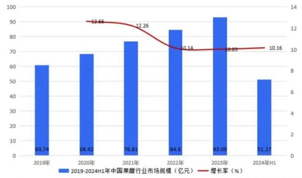 其實(shí)在歐美等發(fā)達(dá)國家,果醋產(chǎn)品已經(jīng)成為潮流飲品。在中國,果醋飲料市場(chǎng)雖然也算得上是一片藍(lán)海,但同歐美日韓等國家相比還處于前期發(fā)展階段。果醋飲料在中國風(fēng)靡的時(shí)間并不算長(zhǎng),雖然是小眾飲料,但最近幾年也得到了迅猛的發(fā)展。據(jù)智研瞻統(tǒng)計(jì)數(shù)據(jù)顯示,2019年中國果醋行業(yè)市場(chǎng)規(guī)模60.74億元,2024年H1中國果醋行業(yè)市場(chǎng)規(guī)模51.27億元,同比增長(zhǎng)10.16%。