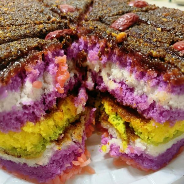 花糕 traditionally 是用糯米粉、粳米粉層層疊蒸,夾入紅豆沙、果脯、堅(jiān)果,形如寶塔,色彩繽紛,象征五谷豐登、家庭興旺。