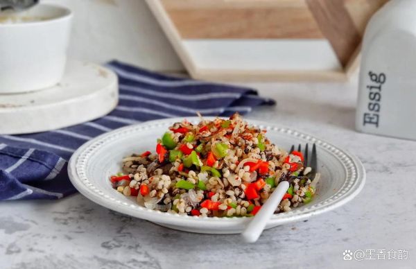這道菜顏值高又好吃!先把高粱米煮15分鐘至熟,過一下冷水。起鍋熱油,加入紫菜和高粱米翻炒,再加入紅綠椒丁,最后用黑胡椒和鹽調(diào)味即可。五分鐘就能搞定,超級簡單!