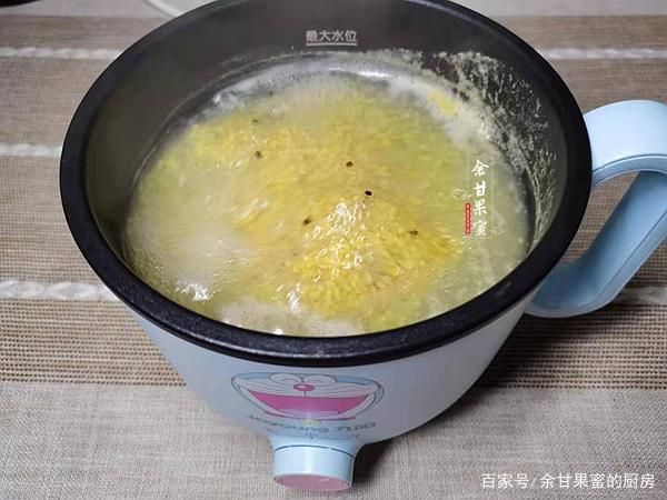 2、小黃米和藜麥開(kāi)水入鍋,攪拌,大火煮制,多攪拌,邊煮邊攪拌,成品香濃黏稠,這樣煮好的小米粥更好喝;