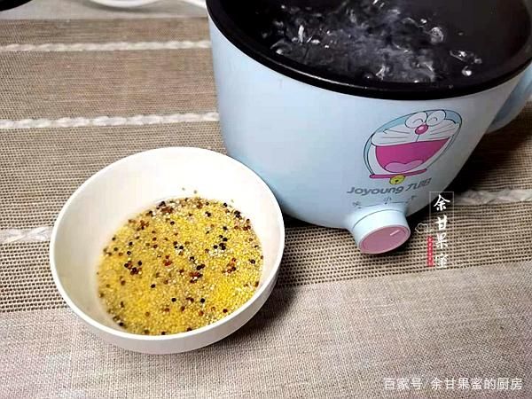 1、先準(zhǔn)備好小黃米、藜麥,50克小黃米和10克藜麥,煮好之后有兩碗,適合兩個(gè)人;另準(zhǔn)備好的小煮鍋,用到了迷你電煮鍋,加入清水約800Ml,大火燒開(kāi);