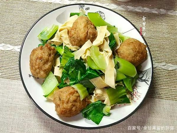 二、青菜肉丸燒干絲:青菜適量、干絲適量、肉丸4個(gè);