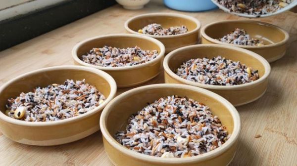 制作材料:原料為一杯大米,半杯糯米,1/4杯小米,1/4杯大麥、1/4杯黑米和8枚干紅棗。
