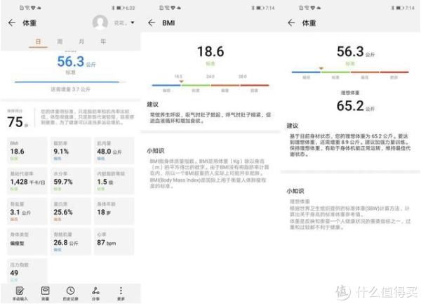在"華為運(yùn)動健康A(chǔ)PP"中,我們可以很直觀的看到大部分測量數(shù)據(jù)。例如,身體得分75分、BMI 18.6、水分率59.7%、脂肪率9.1%等,并且點(diǎn)擊相應(yīng)的數(shù)據(jù),還能看到華為運(yùn)動健康A(chǔ)PP給出的相應(yīng)建議以及關(guān)于此項(xiàng)的小知識。