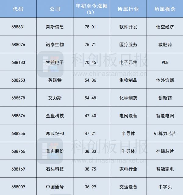 2024上半年科創(chuàng)板行情正式收官,《科創(chuàng)板日?qǐng)?bào)》統(tǒng)計(jì)了年初至今漲幅名列前茅的“十大牛股”。(剔除今年上市新股)