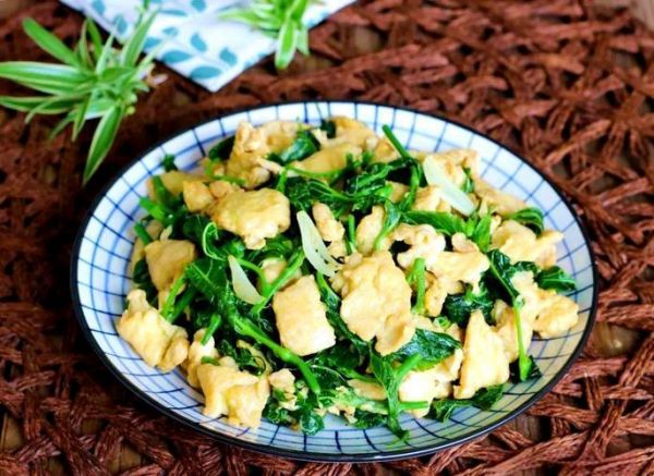 首先,將新鮮的桑葉進(jìn)行焯水處理,之后擠干水分并切成段狀。接下來(lái),把雞蛋打散,加入適量的鹽進(jìn)行調(diào)味,并攪拌均勻。在熱鍋中倒入油,然后下入蛋液進(jìn)行翻炒,待其成形后即可盛出。