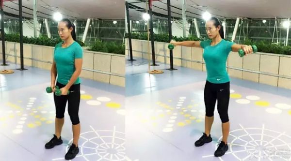 1. 兩腳分開站立,同兩肩寬,拿一對較輕的啞鈴,或者空手,讓兩臂自然下垂,啞鈴在身體兩側(cè);