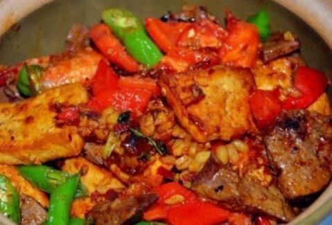 2、起火燒鍋下油,將原料爆香,倒入炸好主料,調(diào)好味,炒勻再加10克清水炒至干身,牛肉切好后要用調(diào)料腌制1小時(shí)