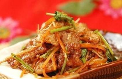1、香菜,大蔥,胡蘿卜切絲。豬里脊肉切厚片,加少許料酒,鹽,胡椒粉腌制入味