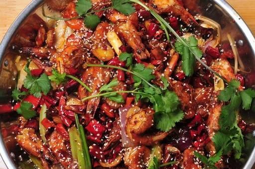 基圍蝦500克、魷魚(yú)200克、藕片100克、萵筍條50克、青紅椒塊共30克、大蒜瓣20克、芹菜段、洋蔥塊、干辣椒節(jié)各10克、香菜段、姜片各5克 干青花椒、添香香鍋醬、鹽、味精、雞精、料酒、香油、紅油、色拉油各適量