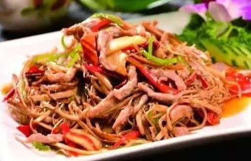 1、牛肉切絲長(zhǎng)8厘米,厚1厘米,鮮茶樹(shù)菇切成8厘米長(zhǎng)段,將牛肉拉油至熟,茶樹(shù)菇炸脆,盛起瀝干油。
