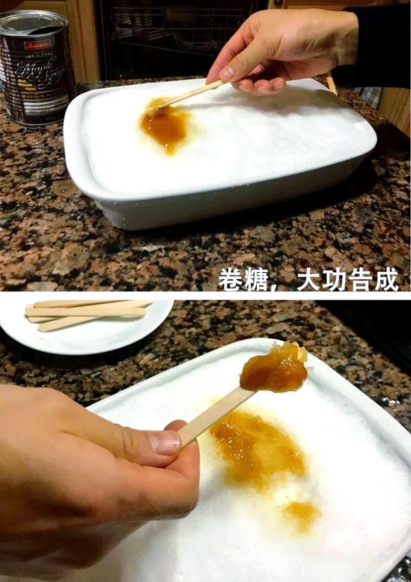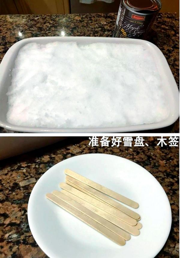 第3步,在盤中鋪滿雪,并壓實(shí)。將木簽置于雪中,準(zhǔn)備卷糖。請注意,雪可以就地取材,非常方便。