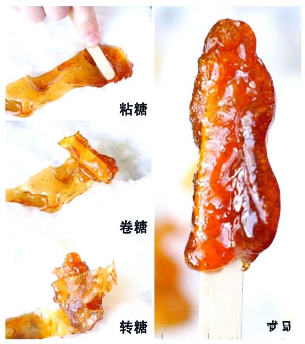 第5步,手持木簽,朝著一個方向慢慢卷起楓糖,直至成形。