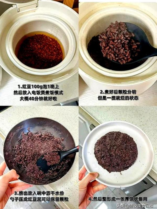 首先,紅豆得提前泡一晚上,第二天煮熟了,瀝干水,用勺子碾成泥,不用太細,帶點顆粒感,嚼著更香。