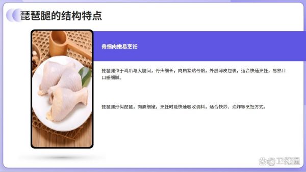 - 琵琶腿:因肉質細嫩、易熟,適合快炒、油炸或空氣炸鍋制作,如椒鹽琵琶腿、蜜汁烤雞小腿。