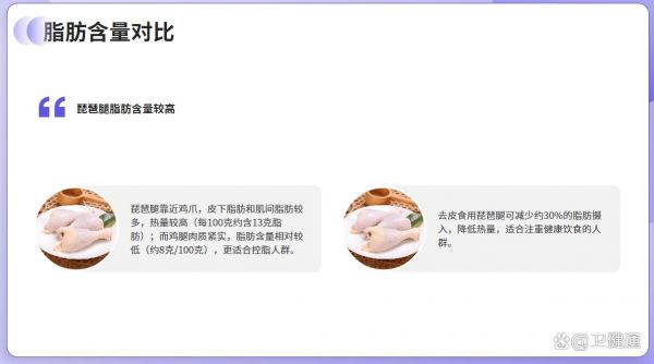 - 脂肪含量:琵琶腿因靠近雞爪,皮下脂肪和肌間脂肪較多,熱量較高(每100克約含13克脂肪);而雞腿肉質緊實,脂肪含量相對較低(約8克/100克),更適合控脂人群。