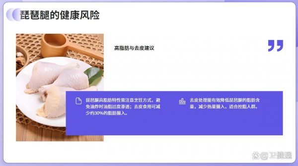 - 琵琶腿:高脂肪特性需注意烹飪方式,避免油炸時油脂過度滲透;去皮食用可減少約30%的脂肪攝入。