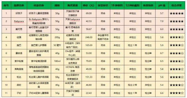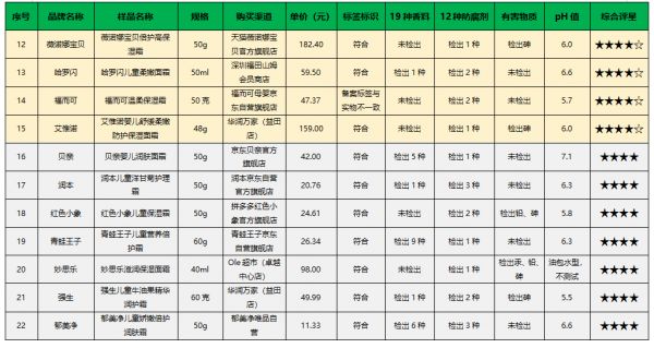 此次兒童護(hù)膚乳霜比較試驗(yàn)由深圳市計(jì)量質(zhì)量檢測研究院承檢。由深圳市消委會(huì)工作人員以普通消費(fèi)者身份在天貓、京東、唯品會(huì)、蘇寧易購、拼多多等線上平臺以及深圳市線下商超共購買22款兒童護(hù)膚乳霜樣品,其中線上電商平臺購買14款,線下商超購買8款,涉及啟初、潤本、紐強(qiáng)、青蛙王子、好孩子、Babycare、子初、薇諾娜寶貝、戴可思、郁美凈、海龜爸爸、松達(dá)、紅色小象共13個(gè)國內(nèi)品牌,艾惟諾、強(qiáng)生、妙思樂、露安適、哈羅閃、宮中秘策、施巴、貝親、福而可共9個(gè)國外品牌,價(jià)格從11.33元到248元不等。