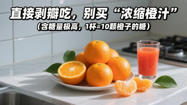 食用建議:直接剝瓣吃,別買濃縮橙汁,含糖量極高,1杯=10顆橙子的糖。