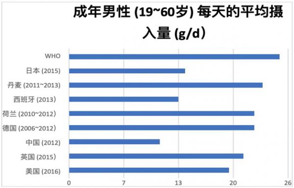 中國居民膳食指南推薦膳食纖維的攝入量25-30g/人/天。而研究顯示97%以上人群膳食纖維攝入量是不足的,中國成年男性每天膳食纖維平均攝入量僅為10g左右,攝入量不足推薦量的一半,成年女性的攝入情況和男性整體一致。