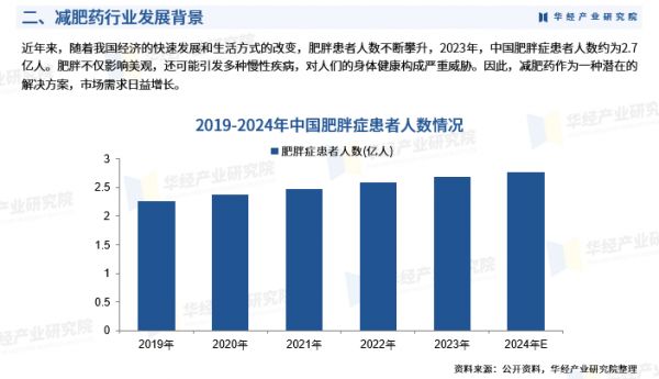 近年來,隨著我國經(jīng)濟(jì)的快速發(fā)展和生活方式的改變,肥胖患者人數(shù)不斷攀升,2023年,中國肥胖癥患者人數(shù)約為2.7億人。肥胖不僅影響美觀,還可能引發(fā)多種慢性疾病,對人們的身體健康構(gòu)成嚴(yán)重威脅。因此,減肥藥作為一種潛在的解決方案,市場需求日益增長。
