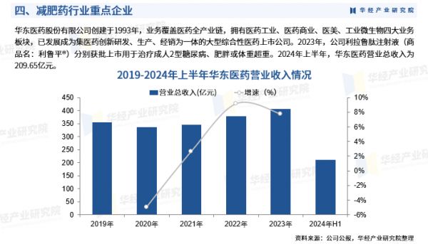 華東醫(yī)藥股份有限公司創(chuàng)建于1993年,業(yè)務(wù)覆蓋醫(yī)藥全產(chǎn)業(yè)鏈,擁有醫(yī)藥工業(yè)、醫(yī)藥商業(yè)、醫(yī)美、工業(yè)微生物四大業(yè)務(wù)板塊,已發(fā)展成為集醫(yī)藥創(chuàng)新研發(fā)、生產(chǎn)、經(jīng)銷為一體的大型綜合性醫(yī)藥上市公司。2023年,公司利拉魯肽注射液(商品名:利魯平)分別獲批上市用于治療成人2型糖尿病、肥胖或體重超重。2024年上半年,華東醫(yī)藥營業(yè)總收入為209.65億元。