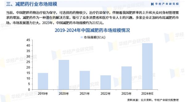 當(dāng)前,中國肥胖藥物治療較為保守,可選擇的藥物很少,治療仍顯保守,伴隨著我國肥胖率的上升和大眾對身材管理需求的增加,減肥藥作為一種潛在的解決方案,吸引了眾多消費(fèi)者和醫(yī)療專業(yè)人士的興趣,多家企業(yè)正加碼布局減肥藥市場,市場發(fā)展?jié)摿薮蟆?023年,中國減肥藥市場規(guī)模約為21億元。